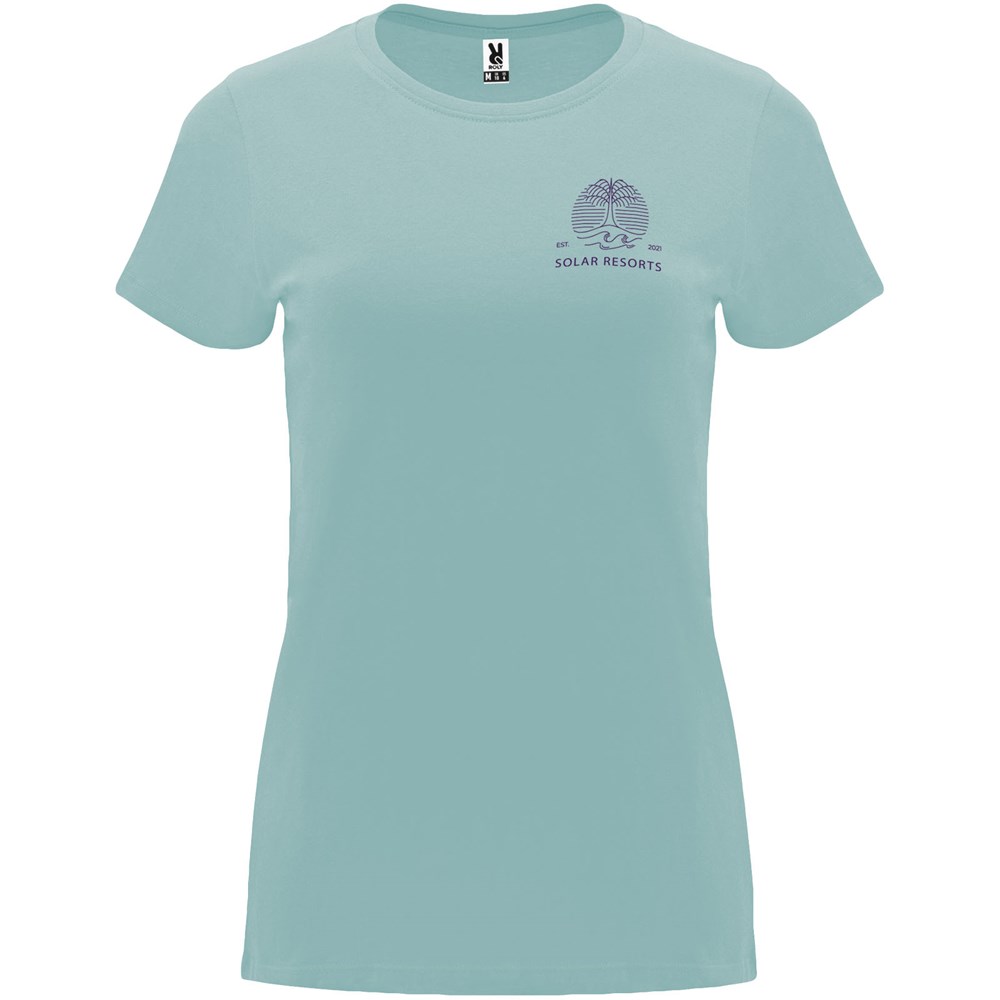 Tailliertes kurzärmeliges T-Shirt für Damen. Rundhalsausschnitt mit 1×1 Rippstrick. Verstärkte und verdeckte Nähte am Kragen. Herausnehmbares Etikett.