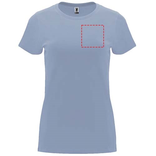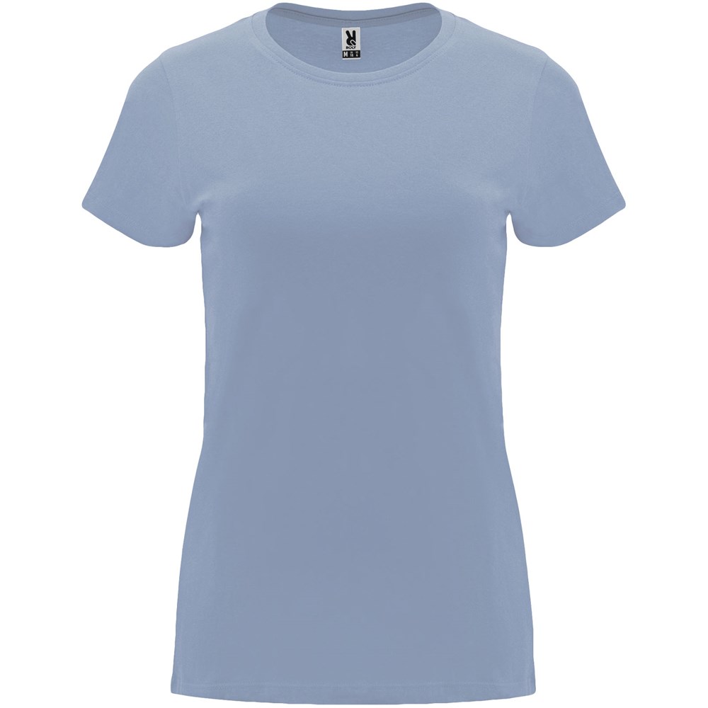 Tailliertes kurzärmeliges T-Shirt für Damen. Rundhalsausschnitt mit 1×1 Rippstrick. Verstärkte und verdeckte Nähte am Kragen. Herausnehmbares Etikett.