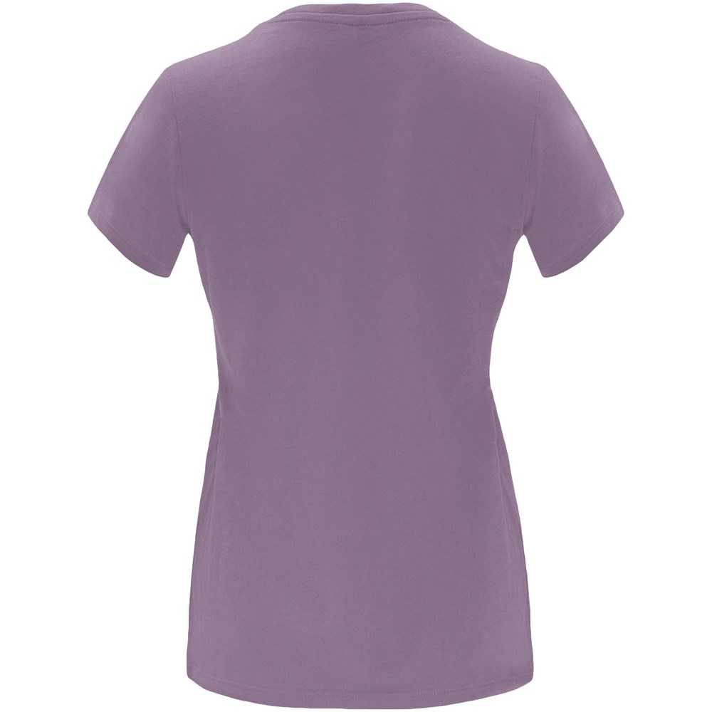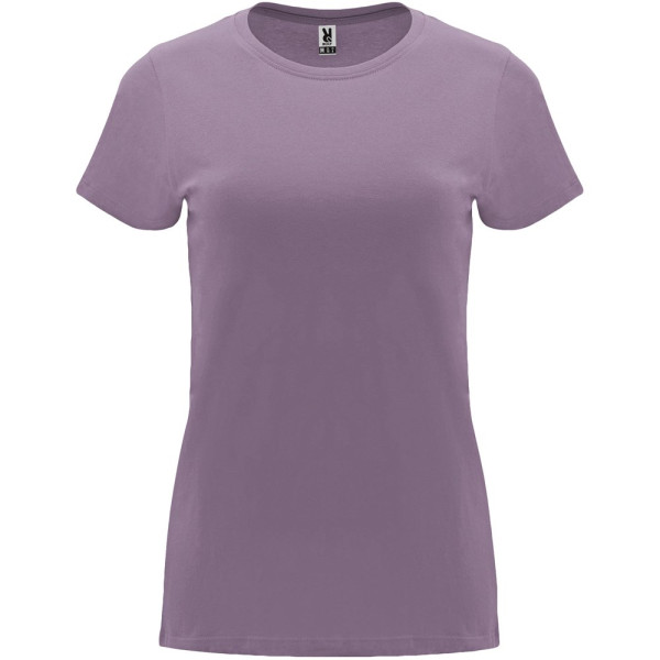 Tailliertes kurzärmeliges T-Shirt für Damen. Rundhalsausschnitt mit 1×1 Rippstrick. Verstärkte und verdeckte Nähte am Kragen. Herausnehmbares Etikett.