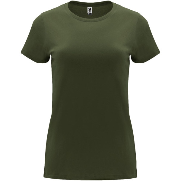 Tailliertes kurzärmeliges T-Shirt für Damen. Rundhalsausschnitt mit 1×1 Rippstrick. Verstärkte und verdeckte Nähte am Kragen. Herausnehmbares Etikett.