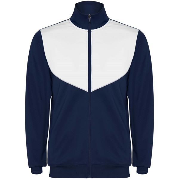 Trainingsanzug aus leichtem und elastischem Stoff. Jacke mit farblich abgesetzten Nähten im Brustbereich. Hoher Kragen mit Kontrastnähten. Zentraler Frontreißverschluss. Seitentaschen. 2x2-Rippenbündchen an Ärmeln und Bund. Hose mit elastischem Bund und Kordelzug. Seitliche Kontrasteinsätze mit Steppnaht. Beinsaum mit Reißverschluss.