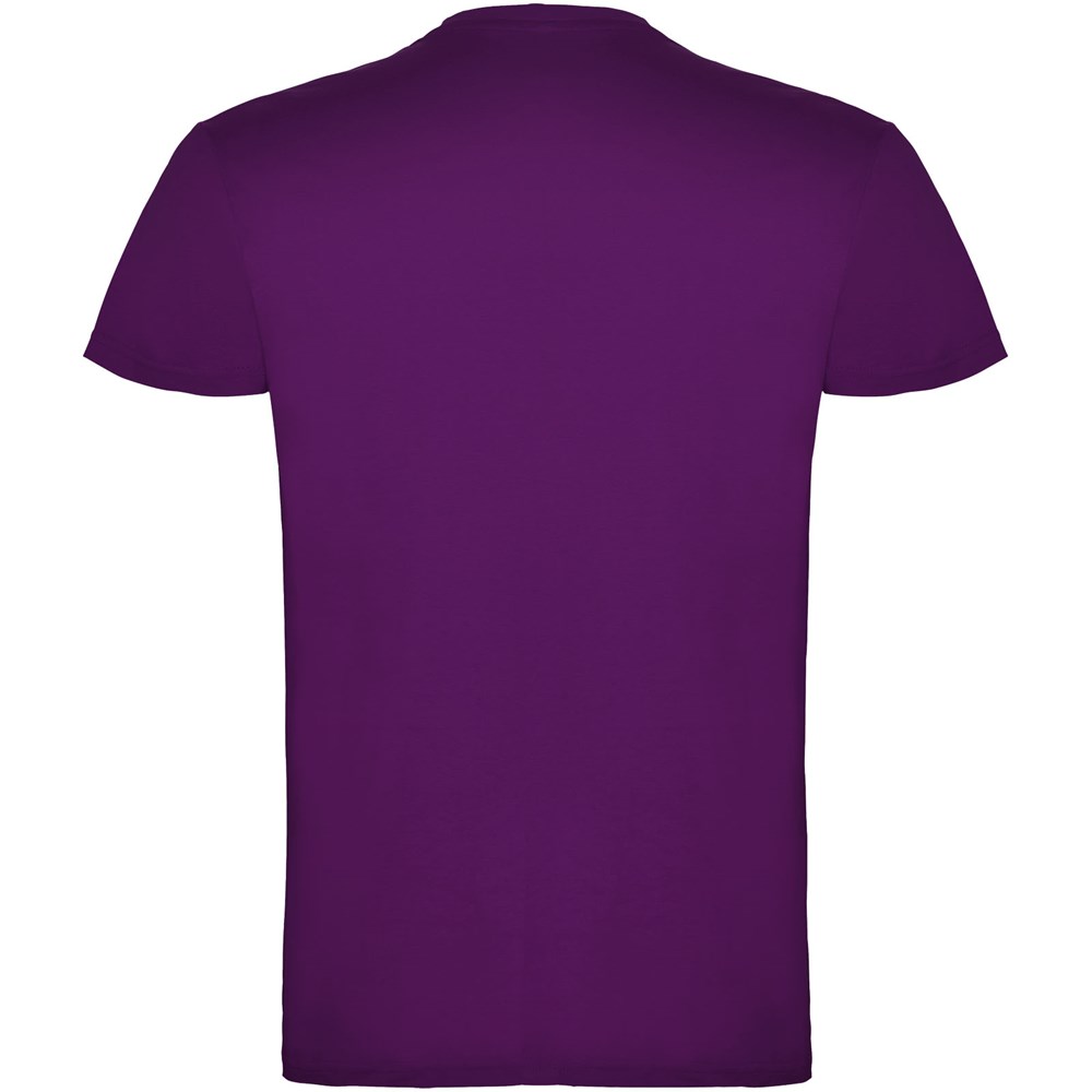 Kurzärmeliges T-Shirt mit doppellagigem Rundhalsausschnitt aus Elasthan, hergestellt aus schlauchförmigem Material für Erwachsene. Verstärkte und verdeckte Nähte am Kragen. Herausnehmbares Etikett. Das Modell ist 190 cm groß und trägt Größe L.