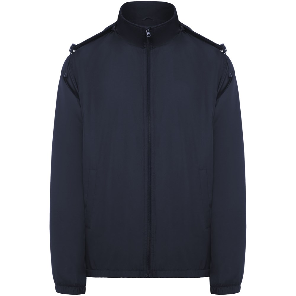 Leichte, wasserabweisende Jacke. Hoher Kragen und einrollbare, verstellbare Kapuze. Innenfutter aus Microfleece. Front-Reißverschluss und Kinnschutz. Elastische Ärmelbündchen. Zwei Seitentaschen mit Reißverschluss. Innere Brusttasche links. Herausnehmbares Etikett. Wasserabweisend. Winddicht. Das männliche Modell ist 184 cm groß und trägt Größe L, das weibliche Modell ist 174 cm groß und trägt Größe S.