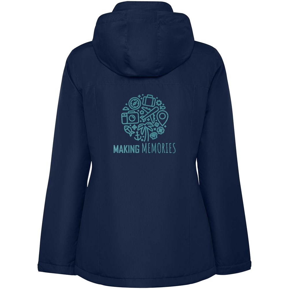 Wasserabweisende, wattierte Parkajacke für Damen. Schlanke Passform. Hoher Kragen mit einrollbarer und abnehmbarer Kapuze mit Klettverschluss. Mittig durchgehender Reißverschluss mit Patte. Seitentaschen mit Reißverschluss und fester Patte. Innentasche mit Klettverschluss. Verstellbare Ärmelbündchen mit Klettverschluss. Verstärkungen im Rücken und auf der linken Brust.