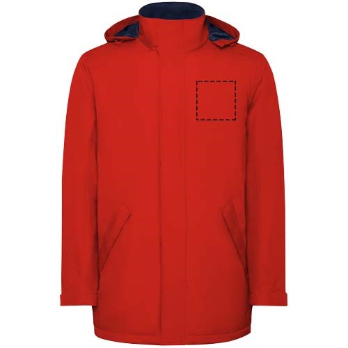 Wasserabweisende, wattierte Parkajacke für Herren. Hoher Kragen mit einrollbarer und abnehmbarer Kapuze mit Klettverschluss. Mittig durchgehender Reißverschluss mit Patte. Seitentaschen mit Reißverschluss und fester Patte. Innentasche mit Klettverschluss. Verstellbare Ärmelbündchen mit Klettverschluss. Verstärkungen im Rücken und auf der linken Brust.