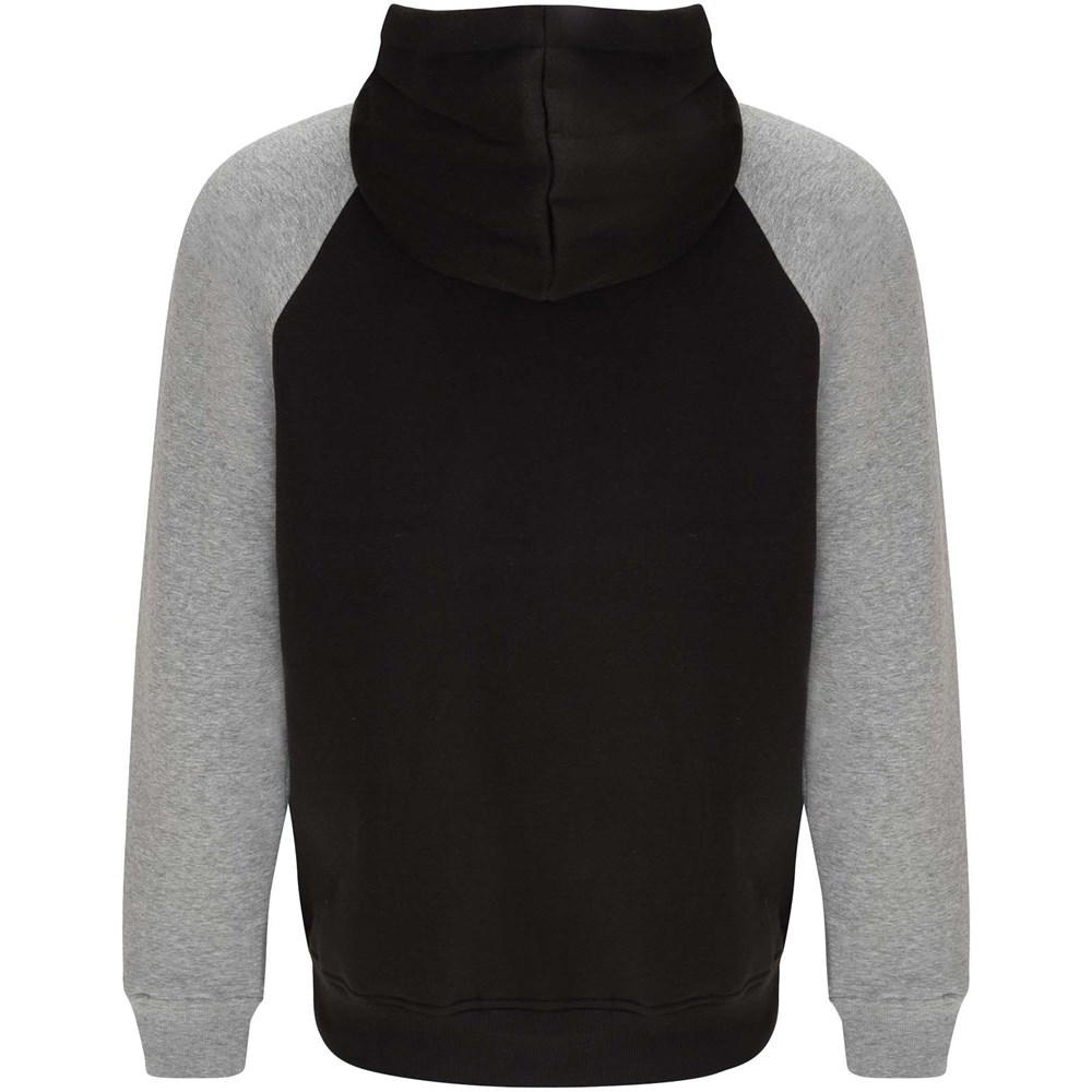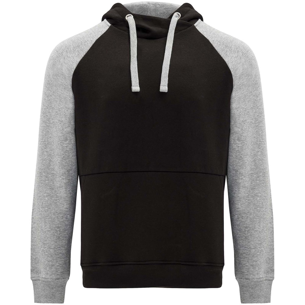 Zweifarbiger Unisex Kapuzenpulli. Kapuze mit gekreuztem Kragen und Metallösen. Innenkapuze, Kordelzug und Raglanärmel in Kontrastfarbe. Kängurutasche. Bündchen und Saum aus elastischem 1×1-Rippstrick. Abnehmbares Etikett.