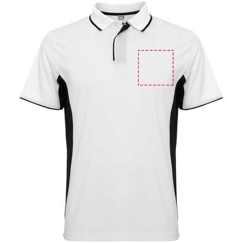 Zweifarbige Kombination. Strickkragen mit 3er-Knopfleiste, verdeckten Nähten und Streifen in Kontrastfarbe. Atmungsaktives Funktionsmaterial, leicht zu waschen und zu trocknen. Abnehmbares Etikett.
