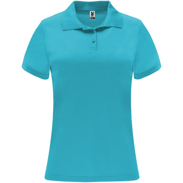 Kurzärmeliges Funktions-Poloshirt für Damen. Gestrickter Kragen mit 3-Knopfleiste. Figurbetonte Passform. Atmungsaktives, leicht zu waschendes und zu trocknendes Material. Herausnehmbares Etikett. Technisches Gewebe. Atmungsaktiver Stoff. Das Modell ist 173 cm groß und trägt Größe S.