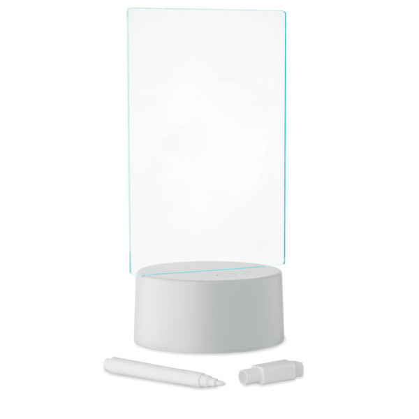 Memoboard mit farblich wechselnder LED-Beleuchtung. Tafel aus Acryl mit Sockel aus PS. Inkl. abwischbarem, weißem Marker. Exkl. 3 x AAA- Batterien.