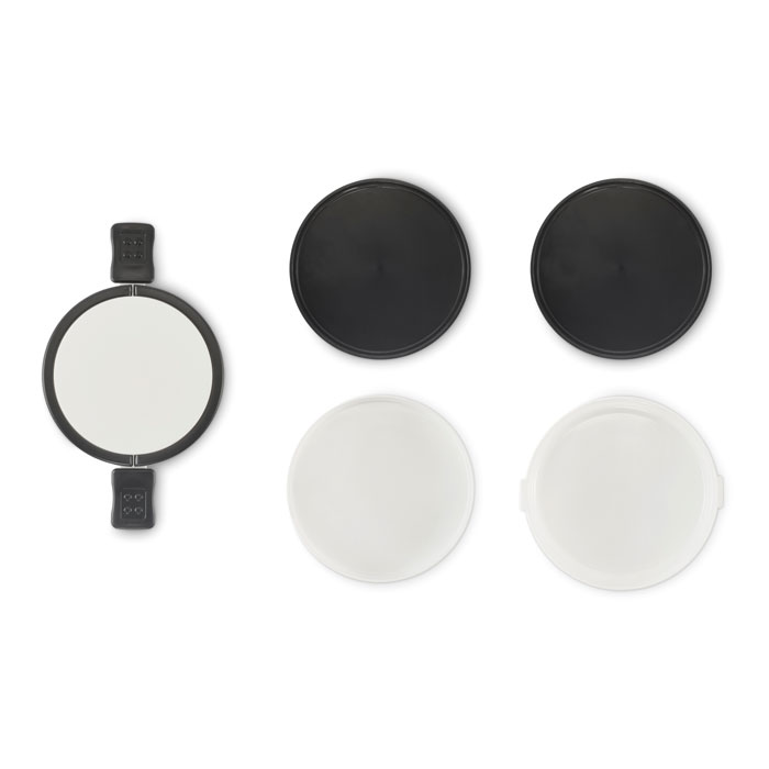 Runde Lunchbox mit 2 Ebenen aus PP. Mit seitlichen Halteklammern und Griffen. Inkl. Innendeckel. Füllmenge: oben 250 ml, unten 700 ml.