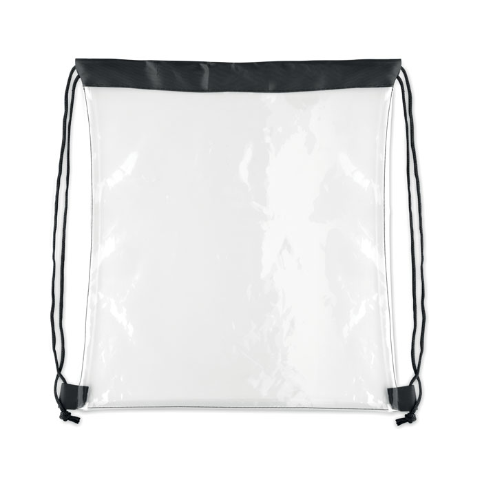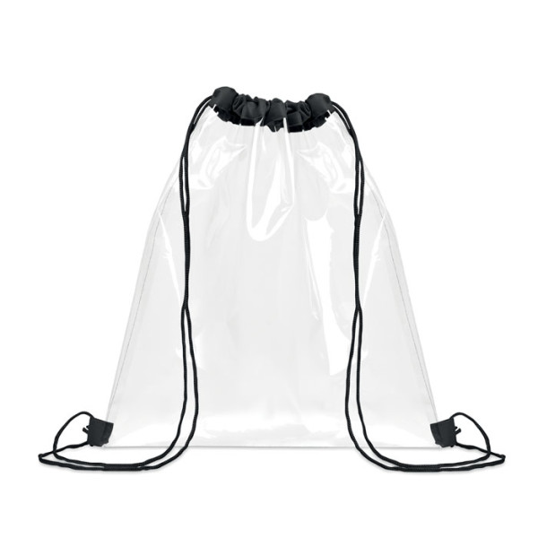 Transparenter Beutel mit Kordelzug aus EVA und PVC. Kordel aus Polyester.