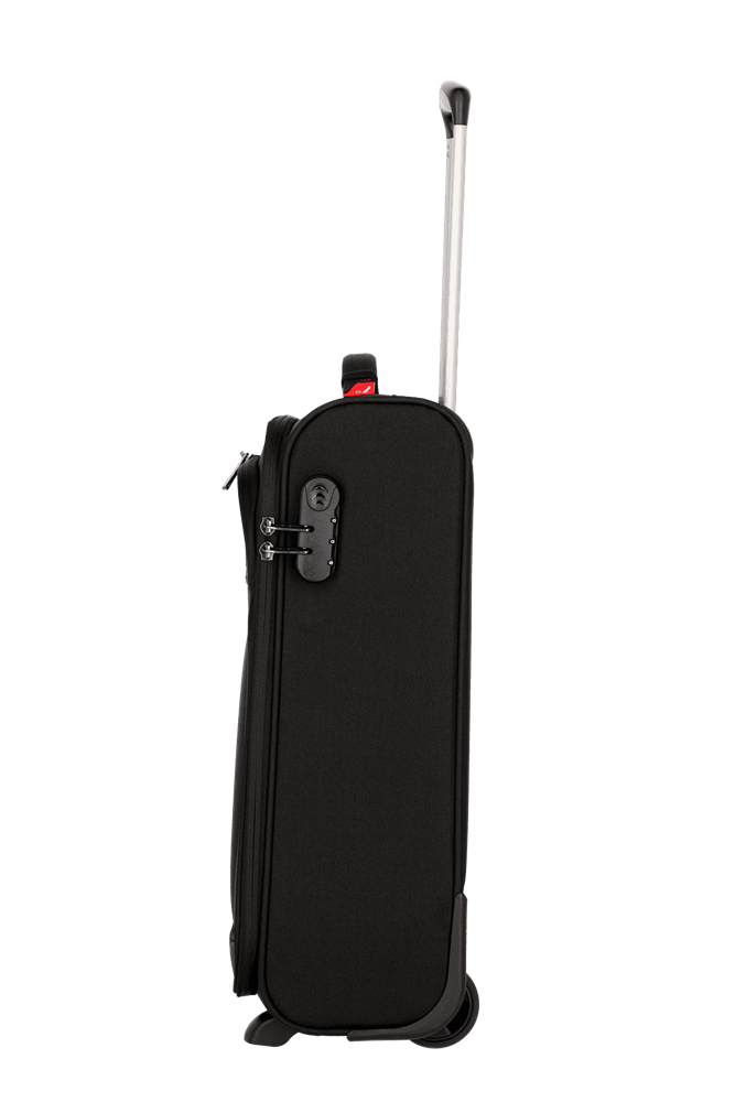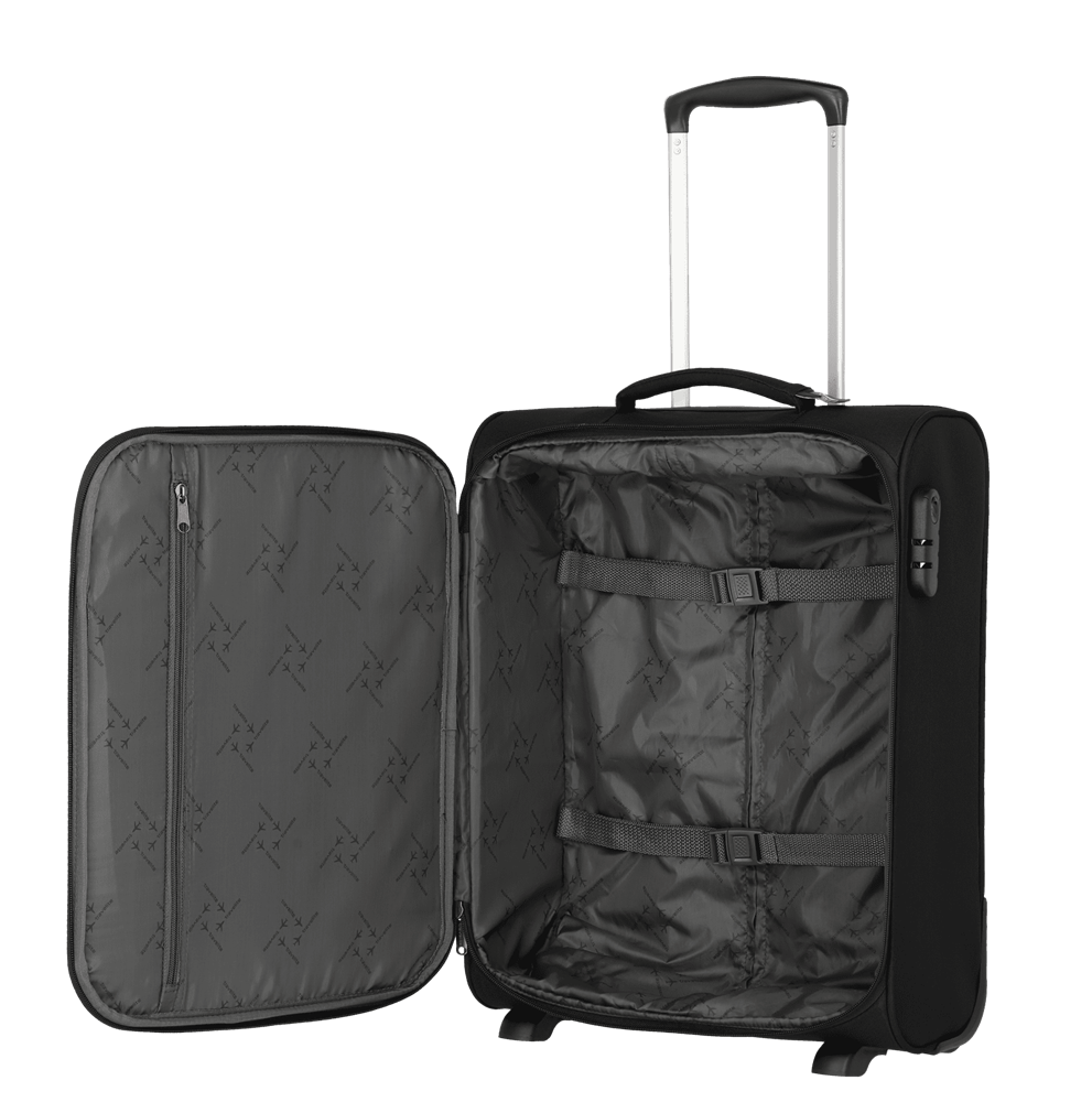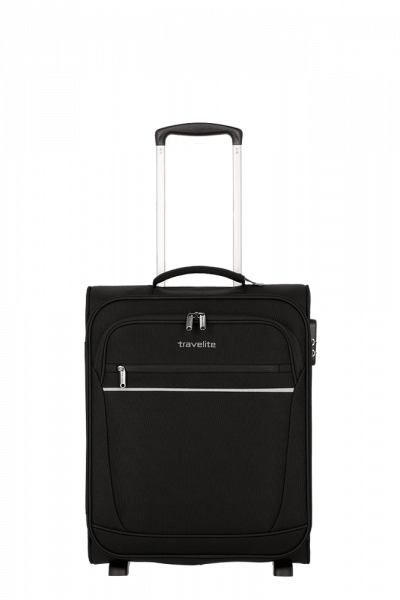 Ideal als Handgepäckstück: der Cabin von travelite. Der Weichgepäcktrolley besteht aus besonders widerstandsfähigem Polyester und wurde für den Einsatz als Bordgepäck entwickelt. Dank seiner kompakten Abmessungen ist er bei vielen Fluggesellschaften als Handgepäck einsetzbar. In den zwei großen Vortaschen finden die Bordkarten oder eine leichte Jacke Platz. Im Inneren überzeugt das Innenfutter in Kombination mit praktischen Packgurten, die Kleidung und Co. sicher an Ort und Stelle halten. Darüber hinaus gibt es ein zusätzliches Hemdenfach mit Reißverschluss im Deckel. Abgesichert wird das Hauptfach mit einem Kombinationsschloss, das vor Eingriffen von außen schützt. Dank der zwei Komfortrollen und des Teleskopgestänges lässt sich der Trolley ganz einfach über verschiedenste Untergründe ziehen. Cabin – einfach perfekt als Begleitung an Bord!
