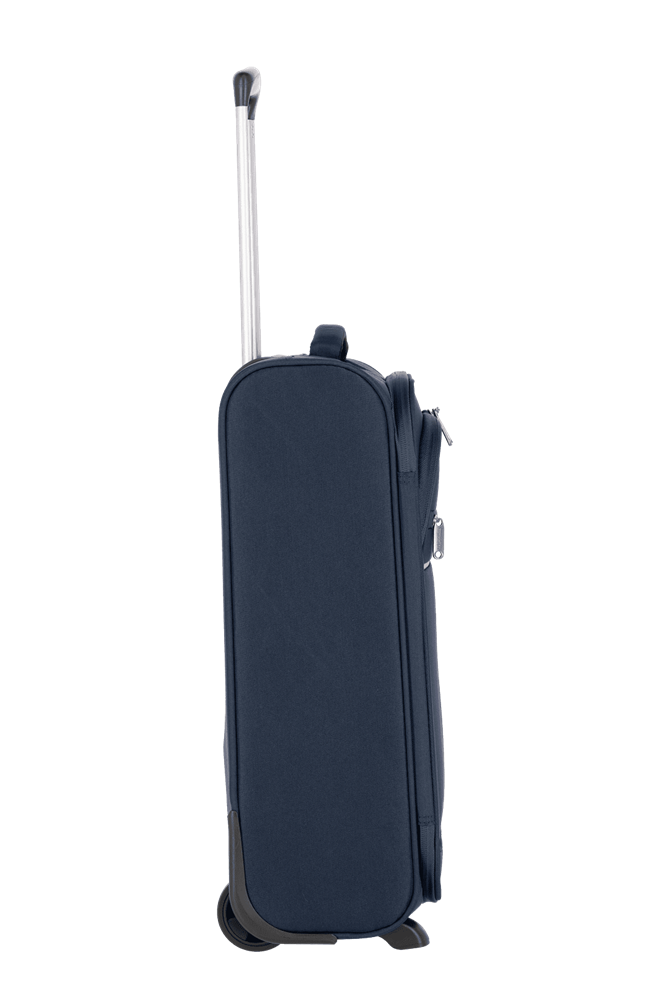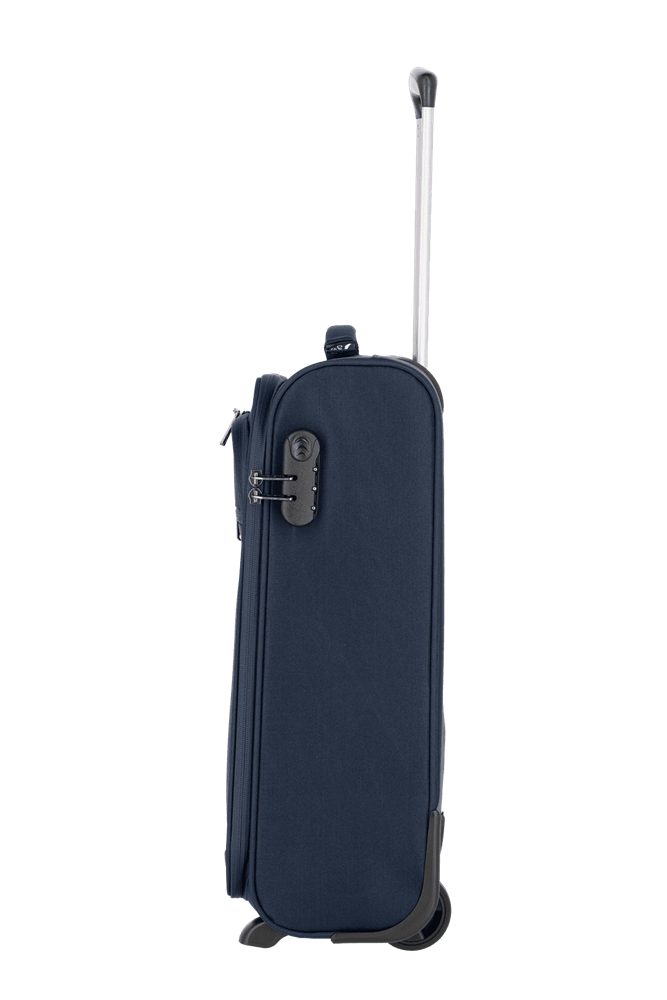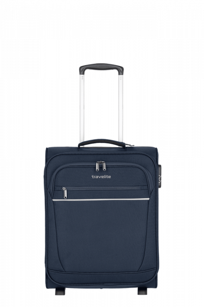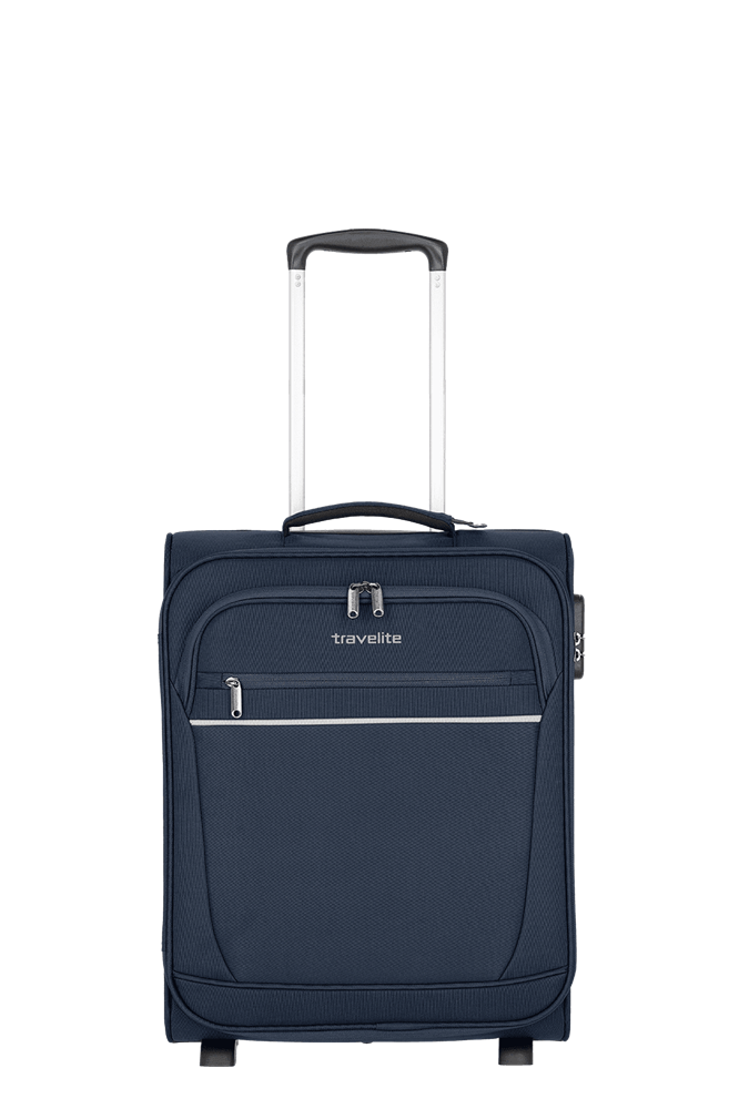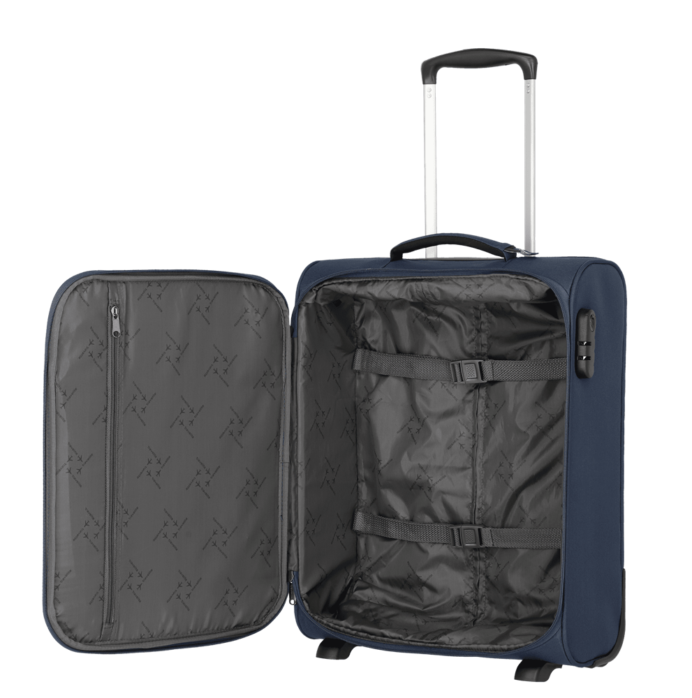 Ideal als Handgepäckstück: der Cabin von travelite. Der Weichgepäcktrolley besteht aus besonders widerstandsfähigem Polyester und wurde für den Einsatz als Bordgepäck entwickelt. Dank seiner kompakten Abmessungen ist er bei vielen Fluggesellschaften als Handgepäck einsetzbar. In den zwei großen Vortaschen finden die Bordkarten oder eine leichte Jacke Platz. Im Inneren überzeugt das Innenfutter in Kombination mit praktischen Packgurten, die Kleidung und Co. sicher an Ort und Stelle halten. Darüber hinaus gibt es ein zusätzliches Hemdenfach mit Reißverschluss im Deckel. Abgesichert wird das Hauptfach mit einem Kombinationsschloss, das vor Eingriffen von außen schützt. Dank der zwei Komfortrollen und des Teleskopgestänges lässt sich der Trolley ganz einfach über verschiedenste Untergründe ziehen. Cabin – einfach perfekt als Begleitung an Bord!