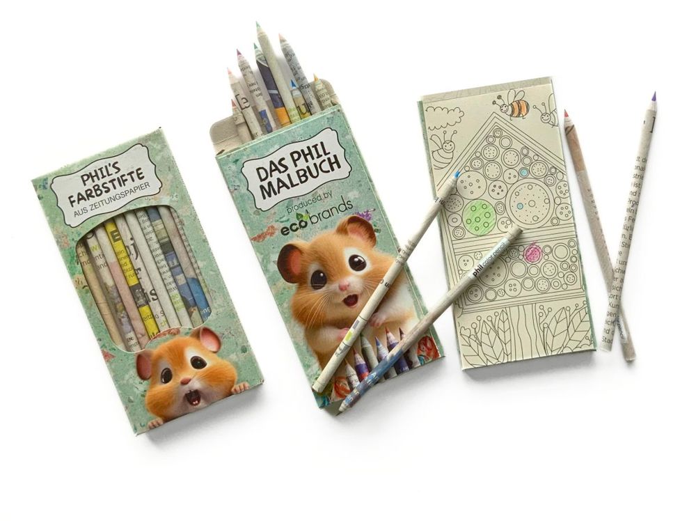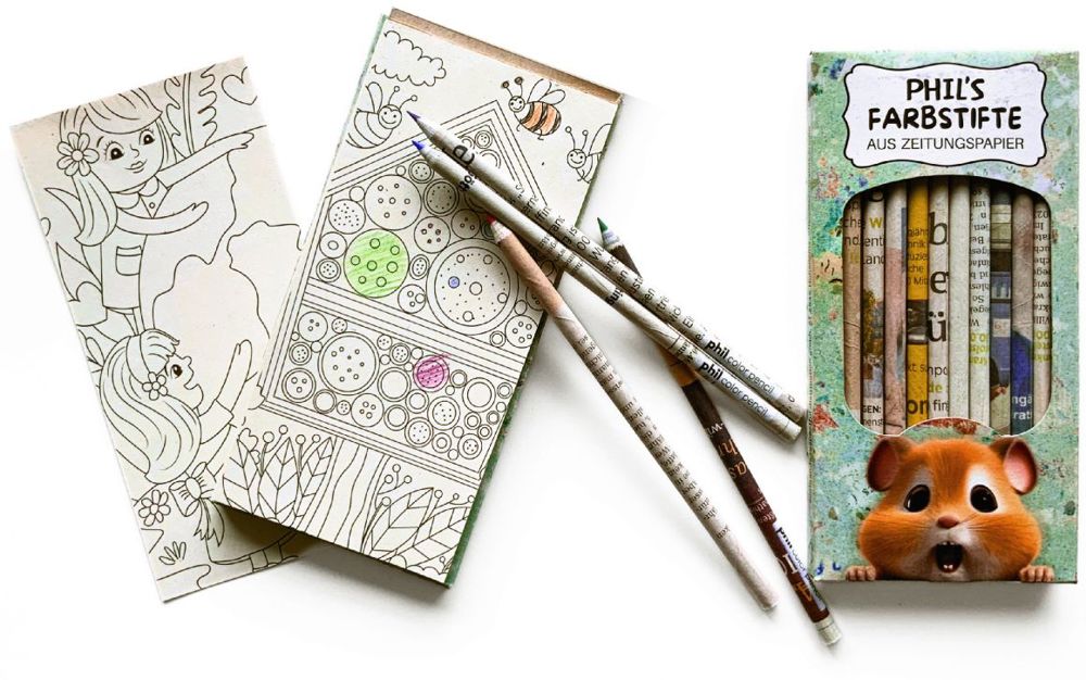- 12 Farbstiften aus Zeitungspapier in Kartonbox