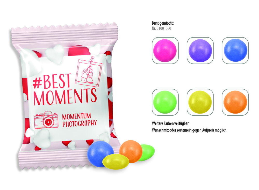 Farbenfrohe Schokolinsen, die nicht nur mit ihrer knackigen Drageehülle überzeugen, sondern auch mit dem zarten Schmelz feinster Vollmilchschokolade im Inneren bringen bunte Freude in die Tüte. Auch sortenrein bestellbar für einen individuellen Farbmix. ,