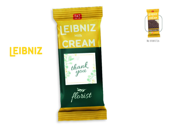 Zwei knusprige Kakaokekse umschließen eine süße Milchcreme und schaffen den perfekten Begleiter für unterwegs. Der leckere Leibniz Milk Cream passt zu jeder Gelegenheit und wird dabei von einer individuell gestaltbaren Banderole umschlossen. , Geschmack: