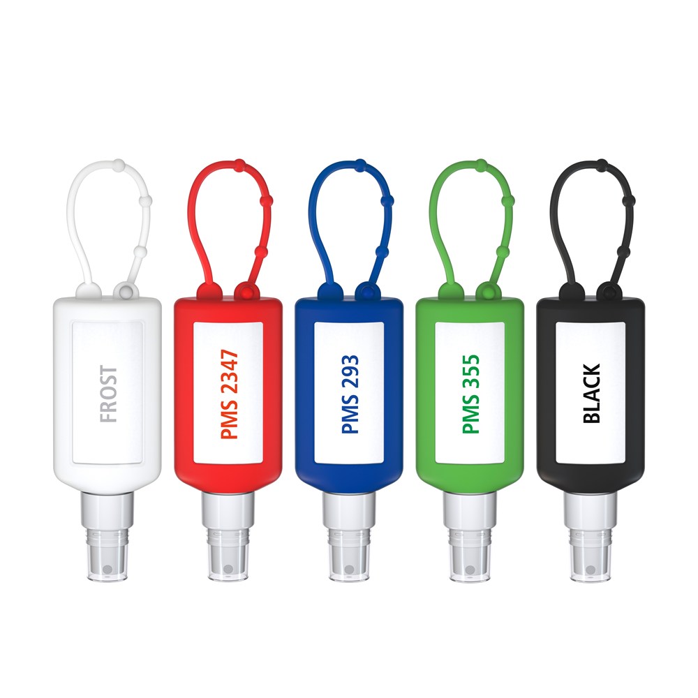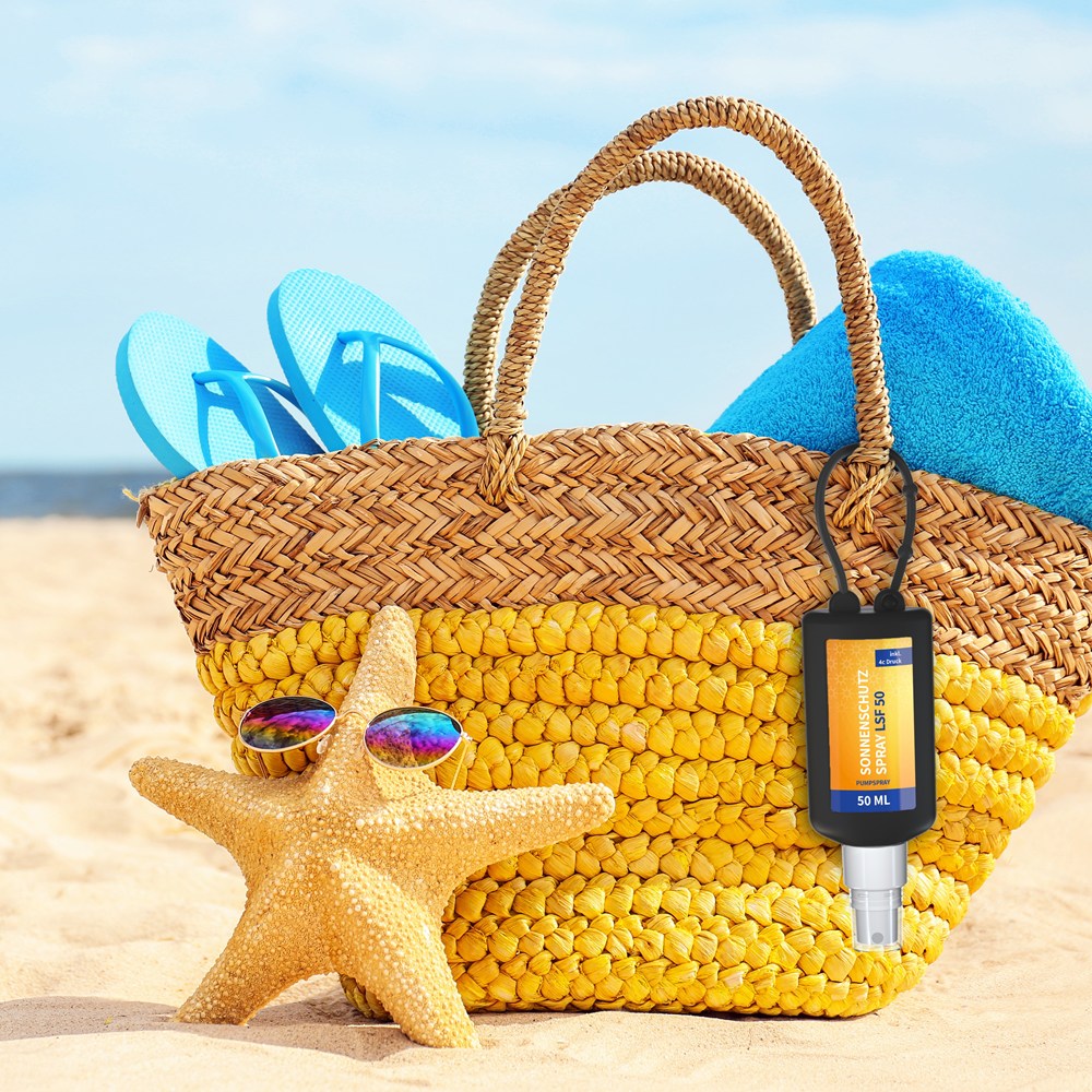 Praktische Kosmetikflasche zum Anhängen! Das Spray mit Silikonhülle ist nicht nur optisch ein echter Hingucker! Raffiniert mit Schlaufe zum Anhängenan de Strandtasche, den Wander-Rucksack, den Ski-Anorak oder an den Kinderwagen. 50 ml PET Flasche (weiß) mit weißem Pumpaufsatz und transparenter Schutzkappe; Silikonhülle und Schlaufe in schwarz. Nachfüllbar. Flasche hergestellt aus 100% recyceltem PET, weiß mit leichter R-PET-Färbung.