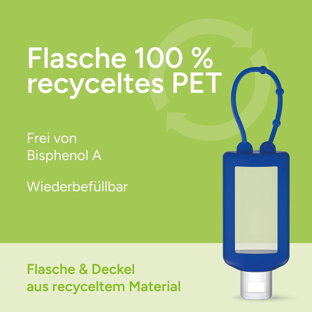 Praktische Kosmetikflasche zum Anhängen! Das Fläschchen mit Silikonhülle ist nicht nur optisch ein echter Hingucker! Raffiniert mit Schlaufe zum Anhängen ans Handgepäck, an den Rucksack oder an den Kinderwagen. 50 ml Flasche aus 100% recyceltem PET, transparent mit leichter R-PET-Färbung. Mit Klappdeckel "weiß" aus recyceltem PP, zufällig ausgerichtet; Silikonhülle und Schlaufe in blau. Nachfüllbar.