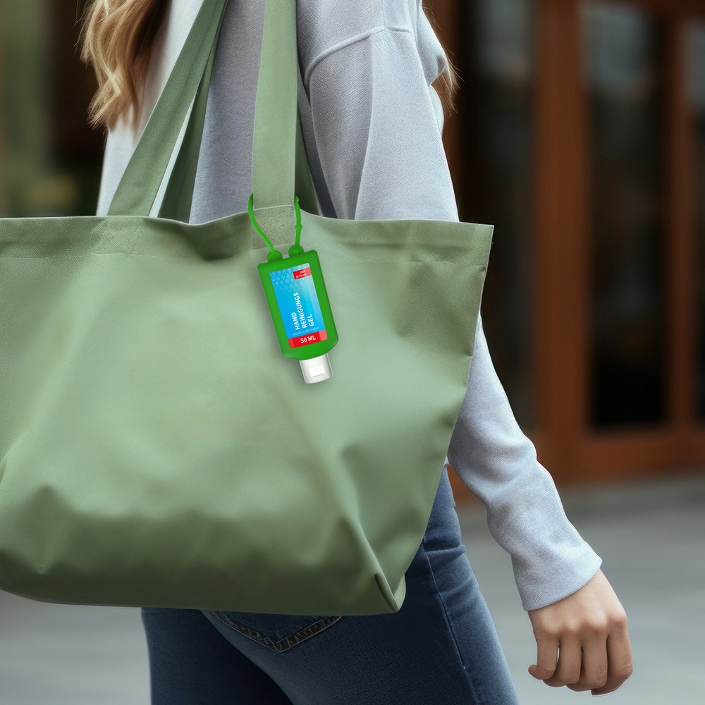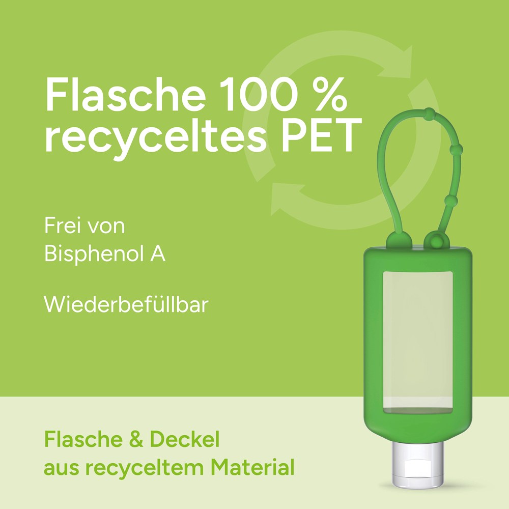 Praktische Kosmetikflasche zum Anhängen! Das Fläschchen mit Silikonhülle ist nicht nur optisch ein echter Hingucker! Raffiniert mit Schlaufe zum Anhängen ans Handgepäck, an den Rucksack oder an den Kinderwagen. 50 ml Flasche aus 100% recyceltem PET, transparent mit leichter R-PET-Färbung. Mit Klappdeckel "weiß" aus recyceltem PP, zufällig ausgerichtet; Silikonhülle und Schlaufe in grün. Nachfüllbar.