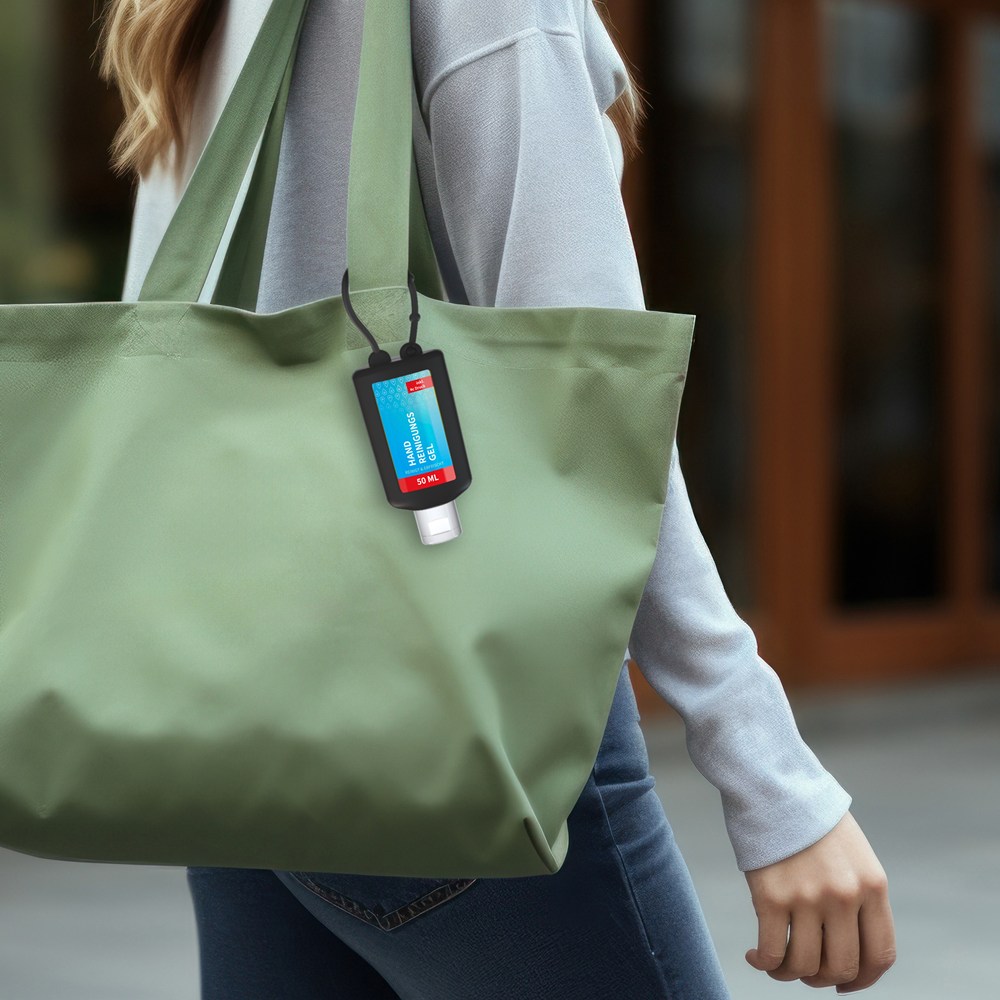 Praktische Kosmetikflasche zum Anhängen! Das Fläschchen mit Silikonhülle ist nicht nur optisch ein echter Hingucker! Raffiniert mit Schlaufe zum Anhängen ans Handgepäck, an den Rucksack oder an den Kinderwagen. 50 ml Flasche aus 100% recyceltem PET, transparent mit leichter R-PET-Färbung. Mit Klappdeckel "weiß" aus recyceltem PP, zufällig ausgerichtet; Silikonhülle und Schlaufe in schwarz. Nachfüllbar.