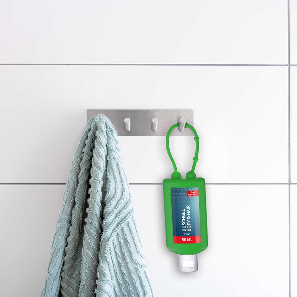 Praktische Kosmetikflasche zum Anhängen! Das Fläschchen mit Silikonhülle ist nicht nur optisch ein echter Hingucker! Raffiniert mit Schlaufe zum Anhängen an den Rucksack, an die Sporttasche, an den Kinderwagen oder natürlich im Bad unter der Dusche. 50 ml Flasche aus 100% recyceltem PET, transparent mit leichter R-PET-Färbung. Mit Klappdeckel "weiß" aus recyceltem PP, zufällig ausgerichtet; Silikonhülle und Schlaufe in grün. Nachfüllbar.