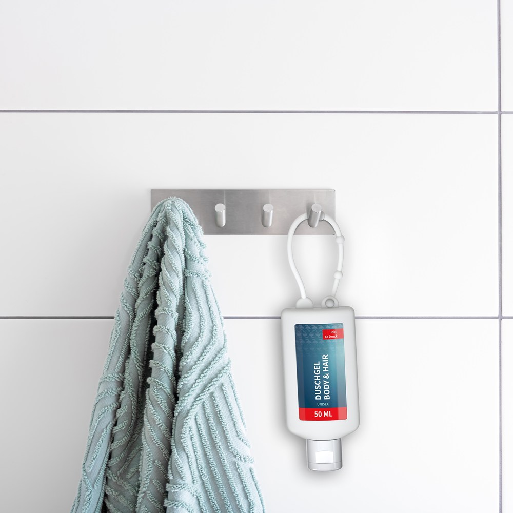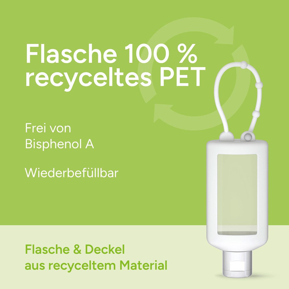 Praktische Kosmetikflasche zum Anhängen! Das Fläschchen mit Silikonhülle ist nicht nur optisch ein echter Hingucker! Raffiniert mit Schlaufe zum Anhängen an den Rucksack, an die Sporttasche, an den Kinderwagen oder natürlich im Bad unter der Dusche. 50 ml Flasche aus 100% recyceltem PET, transparent mit leichter R-PET-Färbung. Mit Klappdeckel "weiß" aus recyceltem PP, zufällig ausgerichtet; Silikonhülle und Schlaufe in frost. Nachfüllbar.