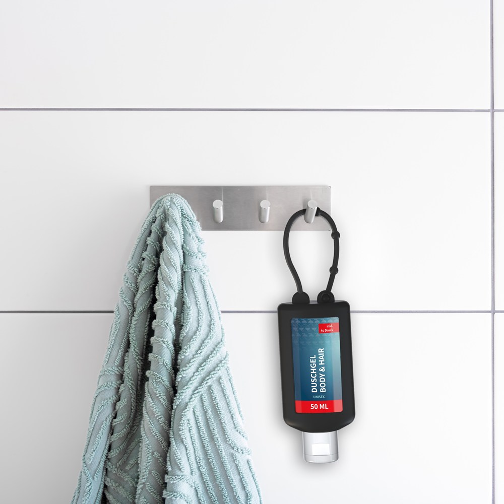 Praktische Kosmetikflasche zum Anhängen! Das Fläschchen mit Silikonhülle ist nicht nur optisch ein echter Hingucker! Raffiniert mit Schlaufe zum Anhängen an den Rucksack, an die Sporttasche, an den Kinderwagen oder natürlich im Bad unter der Dusche. 50 ml Flasche aus 100% recyceltem PET, transparent mit leichter R-PET-Färbung. Mit Klappdeckel "weiß" aus recyceltem PP, zufällig ausgerichtet; Silikonhülle und Schlaufe in schwarz. Nachfüllbar.