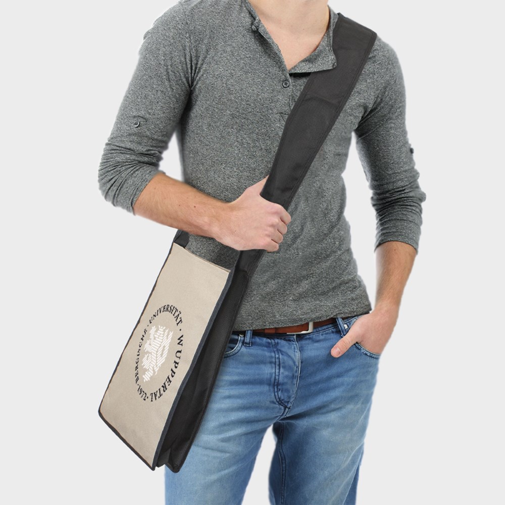 Genf ist eine Schultergurttasche und erinnert in Form und Ausführung an die klassische Postbotentasche. Sie besteht aus einer besonders langlebigen Materialfusion mit Non-Woven innen und recycletem Kraftpapier außen. Die Boden- und Seitenfalte der Tasche sind aus schwarzem Non-Woven Material. Die stabile Tasche Genf ist ein guter Begleiter für Messen und Veranstaltungen. Für Bücher und Unterlagen der ideale Träger. Die ausgefallene Schultertasche aus Papier ist der ideale Werbeträger für Unternehmen der Papier- und Druckindustrie und alle Liebhaber dieses Materials. Das besondere an dieser Tasche ist der "Wow-Effekt", den die rafffinierte Materialkombination erzeugt. Eine reißfeste Papiertasche eben.