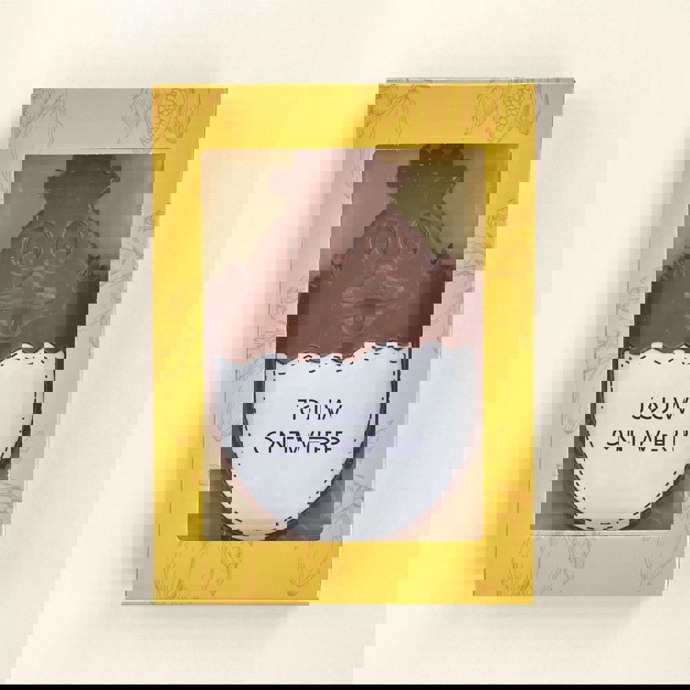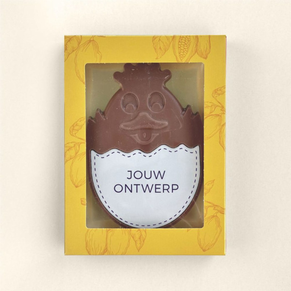 Auf der Suche nach einem Schokoladengeschenk, das alle anderen Osteraufmerksamkeiten übertrifft? Dann entscheide dich für ein Schokoladen-Küken mit vollkommen eigenem Design. Das Küken besteht aus einer köstlichen Milchschokoladentafel (150 Gramm), versehen mit einem Marzipanschild (25 Gramm), auf dem dein Bild/Design angebracht wird. Die von uns verwendete Schokolade ist hervorragend und wird aus unseren nachhaltig produzierten (Cocoa Horizons) Schokoladenrezepturen des belgischen Spitzenherstellers Barry Callebaut hergestellt. Durch ein spezielles Druckverfahren ist es möglich, jedes gewünschte Foto/Bild mit essbaren Farbstoffen auf das Marzipan zu drucken. Die Marzipanschicht wird mit Kakaobutter auf der Milchschokolade befestigt. Das Schokoladen-Küken wird in einer gelben Fensterbox verpackt.