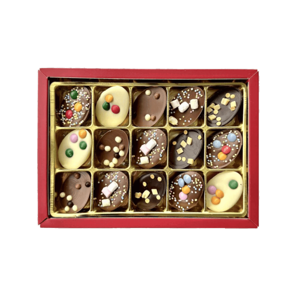 Halbe, massive Ostereier, versehen mit einem dekorativen Topping – hübsch und lecker zugleich. Was für ein Ostergeschenk. Ein Topping in frischen Frühlingsfarben: Mini-Smarties, Karamellstückchen oder Mini-Marshmallows. Die Eier sind aus Milch-, Weiß- und Zartbitterschokolade hergestellt.