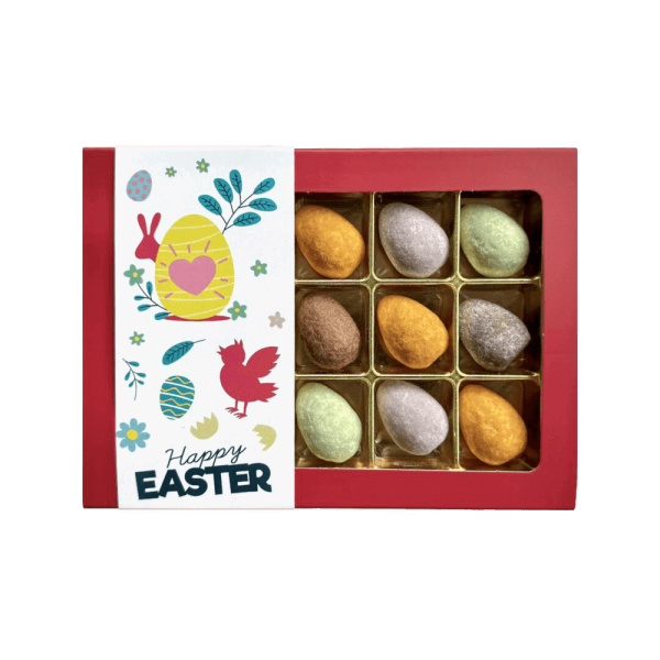 Eine schöne Schmuckschachtel, gefüllt mit handgemachten Ostereiern mit den köstlichsten Füllungen, darunter Karamell, Himbeere und Pistazie. Jedes Osterei wird mit Limburgischer Leidenschaft hergestellt.