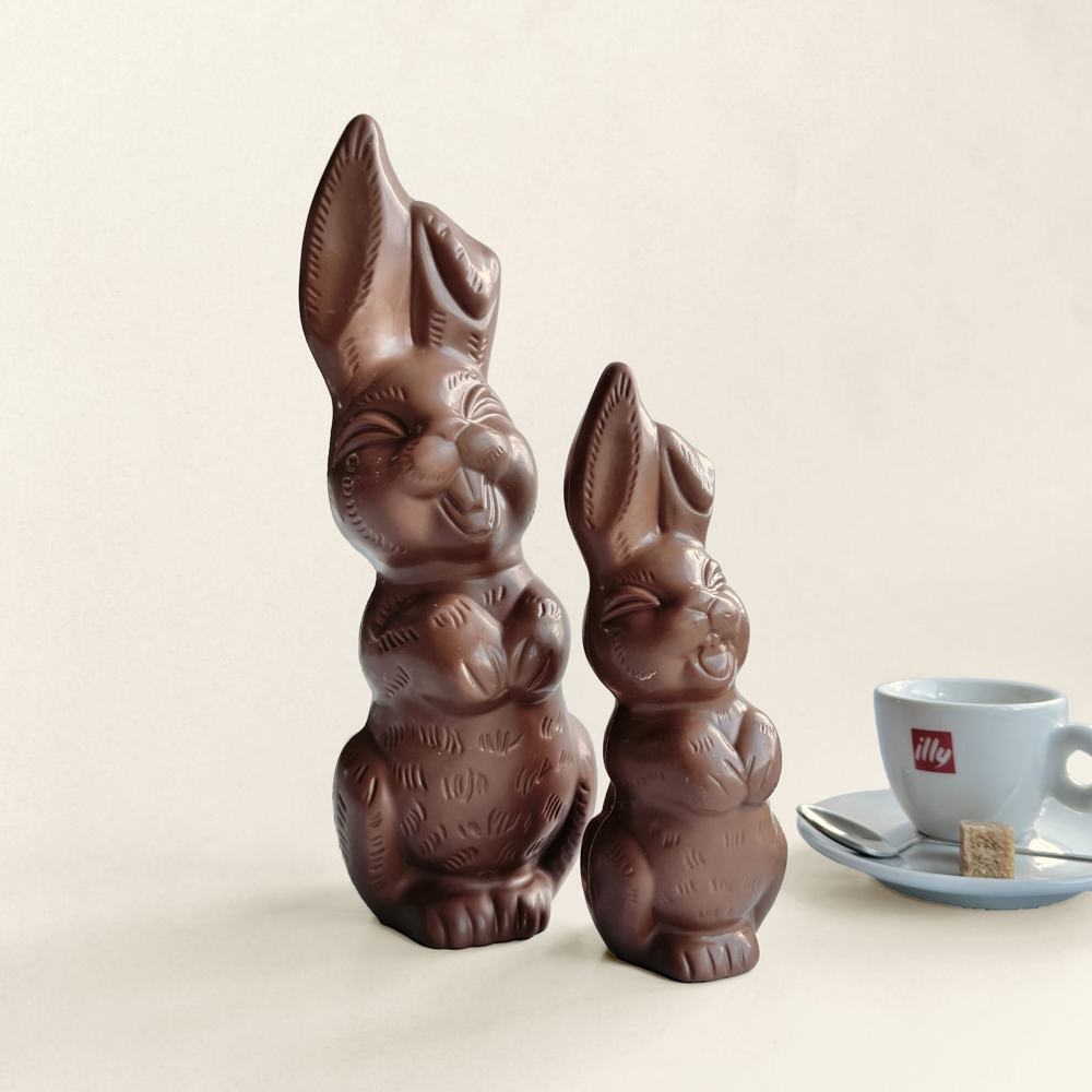 Ein Osterhase aus köstlicher Vollmilchschokolade, verpackt in hübsche transparente Folie. Mindestabnahme 50 Stück. Ausschließlich Großlieferung an eine Adresse möglich.
