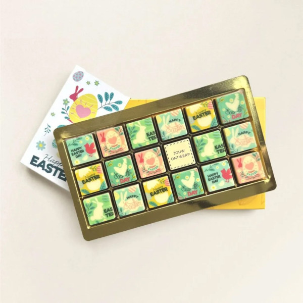 18 Pralinés mit Osteraufdruck – ein köstliches Geschenk zum Verteilen. Damit verschenkst du echtes Ostergefühl; die Pralinés sind mit vier unterschiedlichen, stimmungsvollen Osterdesigns versehen, und auf eines der 12 Schokoladenstücke drucken wir dein Firmenlogo! Das kann einfarbig oder in Vollfarbe erfolgen (ohne Preisunterschied). Überrasche deine Kundschaft mit einem Ostergeschenk aus Schokolade. Eine perfekte Mailing-Idee, die wir gerne für dich an 1 oder 10.000 Adressen versenden.