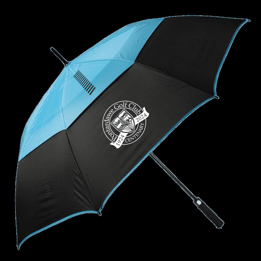 Robuster, leichter Golfregenschirm mit zweilagigem Schirm und Durchmesser von 162 cm. Stiel aus Glasfaser, öffnet auf Knopfdruck. Inklusive Schutzhülle und Doming unten am Griff