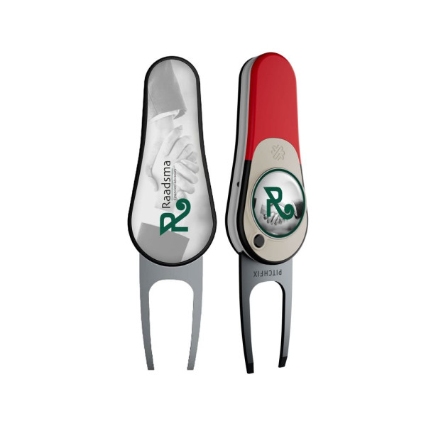Leichte, automatische klappbare Pitchgabel aus hochwertigem ABS-Kunststoff, inkl. magnetischem Golfballmarker mit Doming und euroskala Druck an der Rückseite