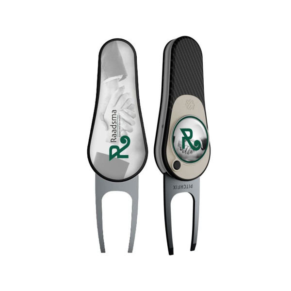 Leichte, automatische klappbare Pitchgabel aus hochwertigem ABS-Kunststoff, inkl. magnetischem Golfballmarker mit Doming und euroskala Druck an der Rückseite