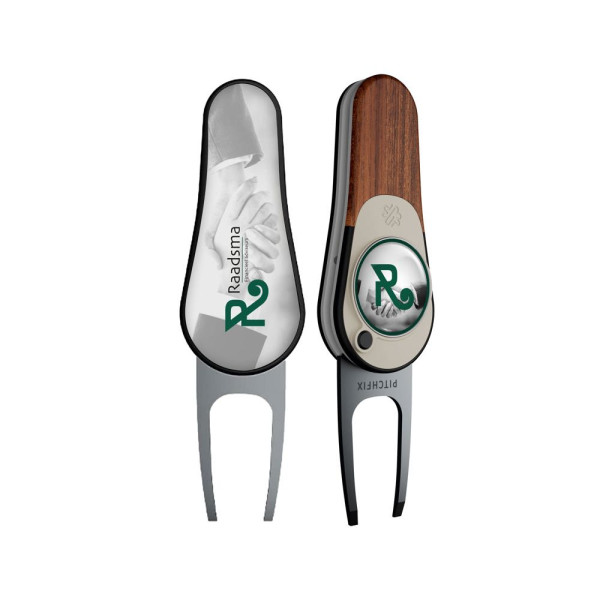 Leichte, automatische klappbare Pitchgabel aus hochwertigem ABS-Kunststoff, inkl. magnetischem Golfballmarker mit Doming und euroskala Druck an der Rückseite