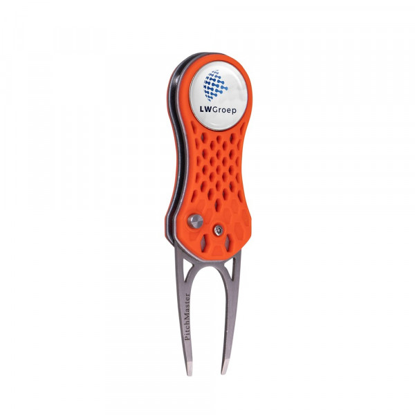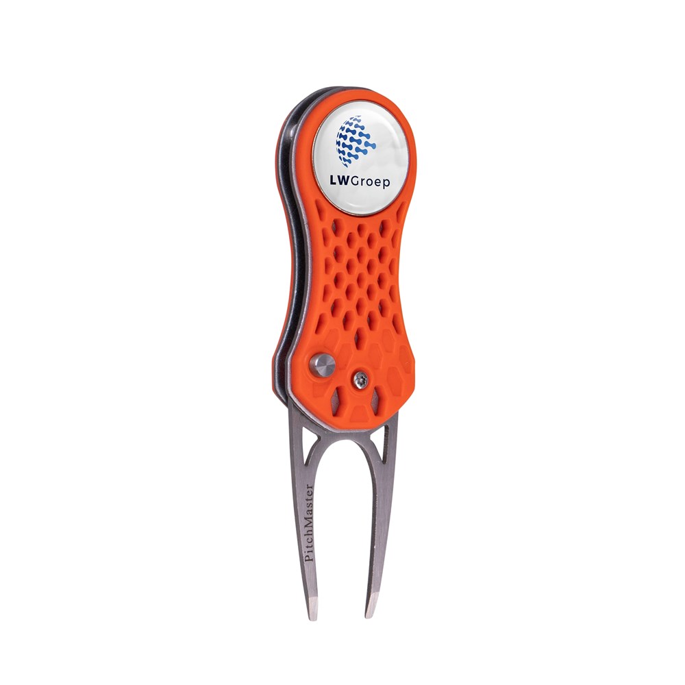 Leichte Pitchgabel aus Aluminium mit Kunststoffgehäuse und automatischem klappsystem, inkl. magnetischem Golfballmarker mit Doming