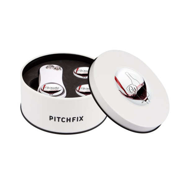 Zuschlag für Geschenkverpackungen aus Metall für den Pitchfix Original 2.0, Hybrid 2.0, Fusion 2.5 oder XL 3.0. Inkl. 2 zusätzliche Golfballmarkers mit Doming sowie großem Doming auf dem Deckel. Exkl. Pitchfix.