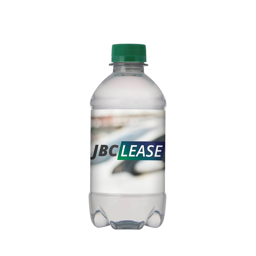 330 ml Quellwasser in einer transparenten Flasche mit Drehverschluß, Flasche aus 100% recyceltem Plastic (R-PET), inklusive Kunststoff Etikett rundum