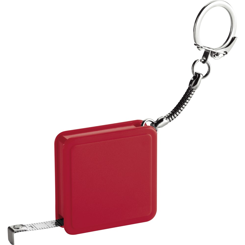 Schlüsselanhänger mit handlichem 1 Meter Stahlbandmaß. Ihre Werbung drucken wir auf das Gehäuse.