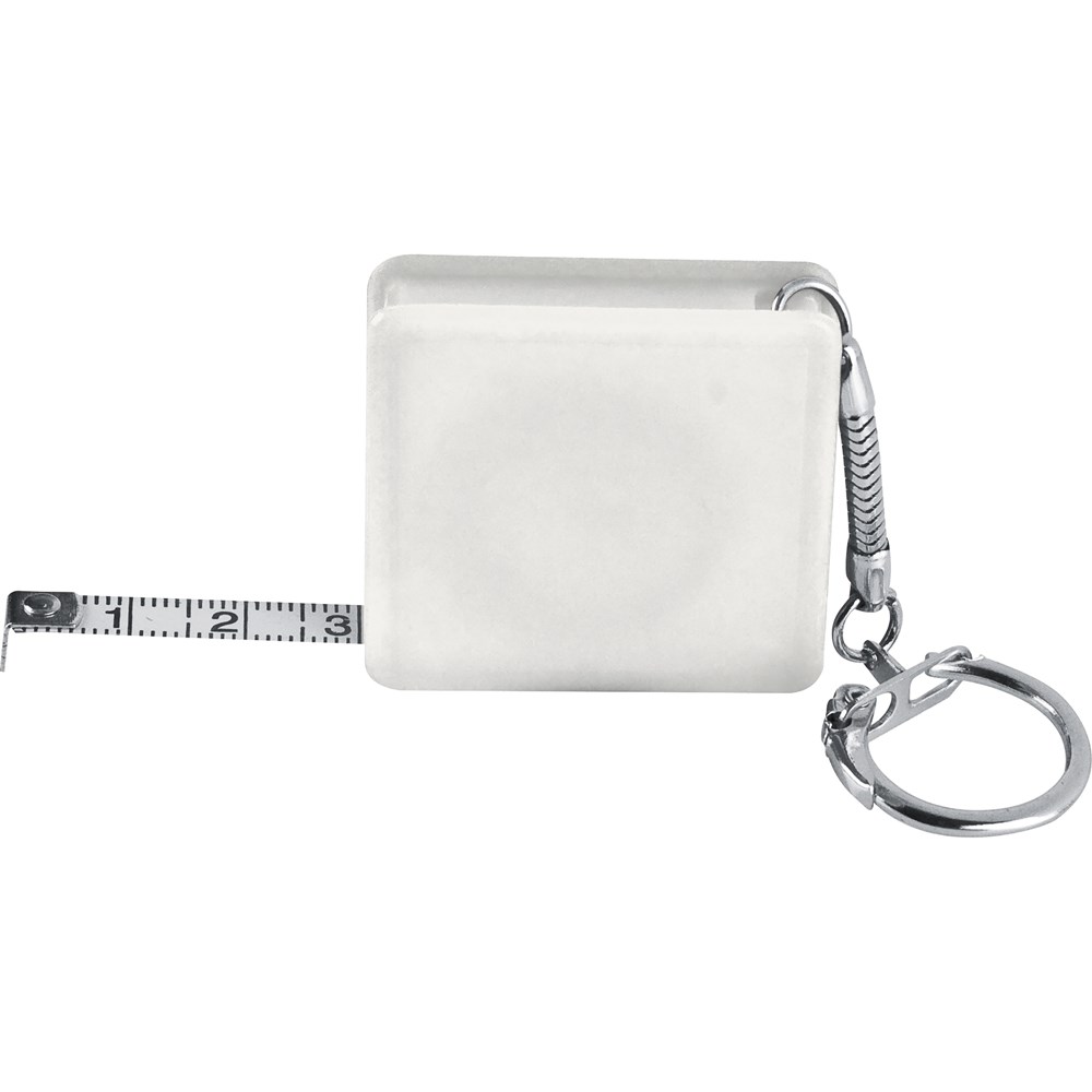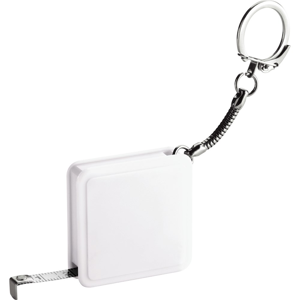 Schlüsselanhänger mit handlichem 1 Meter Stahlbandmaß. Ihre Werbung drucken wir auf das Gehäuse.