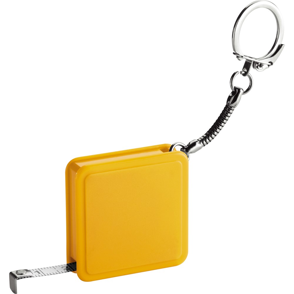 Schlüsselanhänger mit handlichem 1 Meter Stahlbandmaß. Ihre Werbung drucken wir auf das Gehäuse.