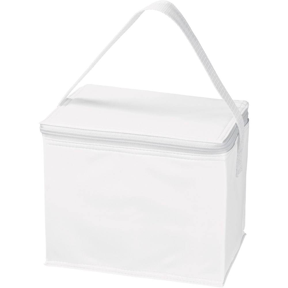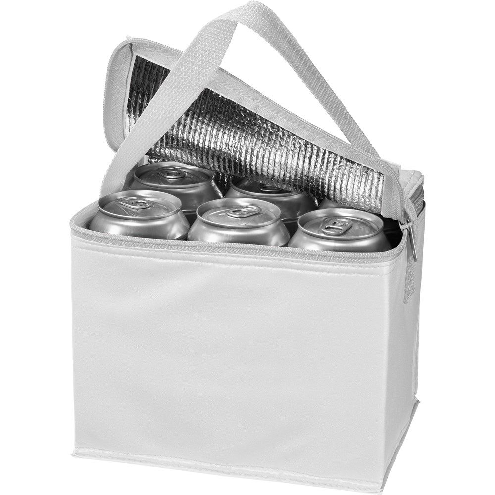 Kühltasche aus 70D Polyester. Platz für sechs große Dosen oder sechs kleine Flaschen je 500ml. Ihre Werbung drucken wir mittig auf den Deckel.
