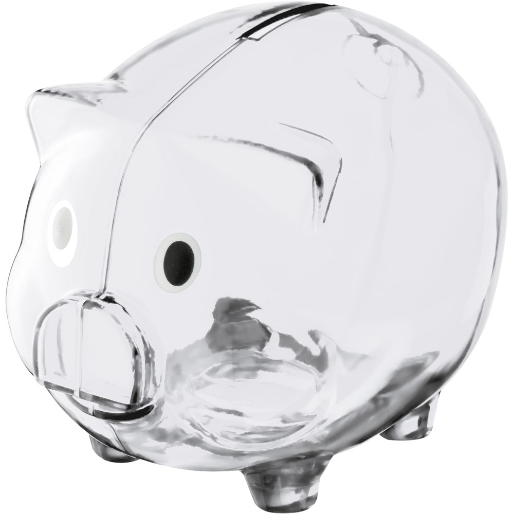 Lustiges Sparschweinchen aus Kunststoff. Ihre Werbung drucken wir auf eine Seite des Sparschweins.