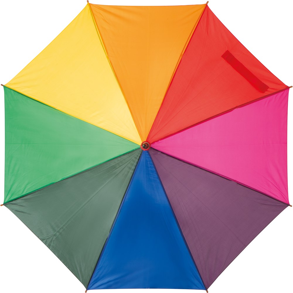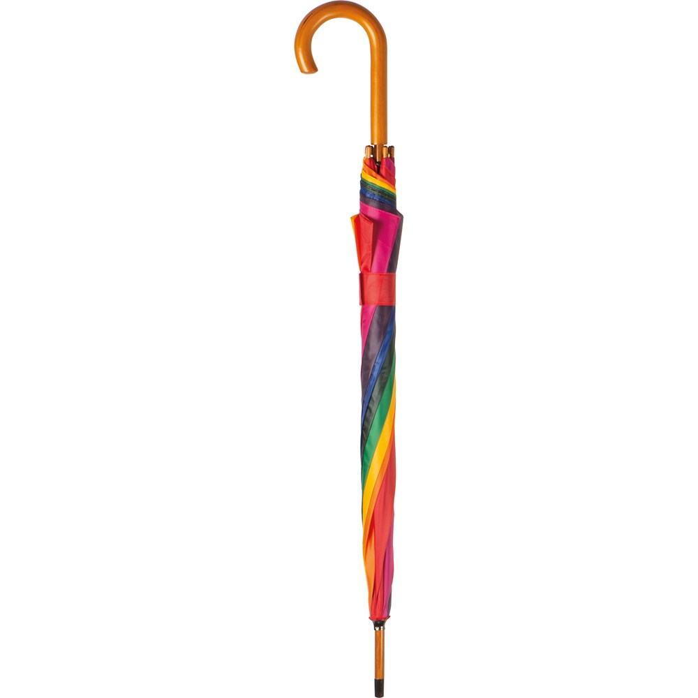 Attraktiver, multicolor Automatikschirm mit 190T Polyesterbespannung, gebogenem Holzgriff und Holzschaft, sowie einem Metallgestänge. Ihre Werbung drucken wir auf ein Segment.