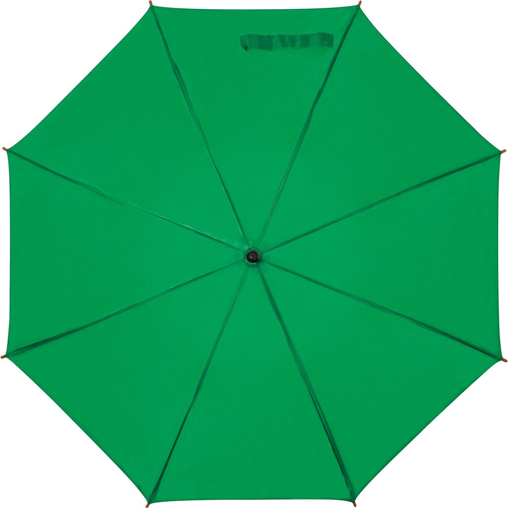 Der Klassiker, Automatikregenschirm mit 190T Polyesterbespannung, Echtholzschaft u. -griff sowie einem Metallgestänge mit Hochleistungsautomatikfeder. Ihre Werbung drucken wir auf ein Segment.