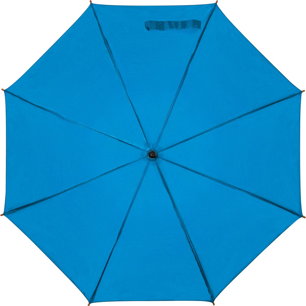 Der Klassiker, Automatikregenschirm mit 190T Polyesterbespannung, Echtholzschaft u. -griff sowie einem Metallgestänge mit Hochleistungsautomatikfeder. Ihre Werbung drucken wir auf ein Segment.