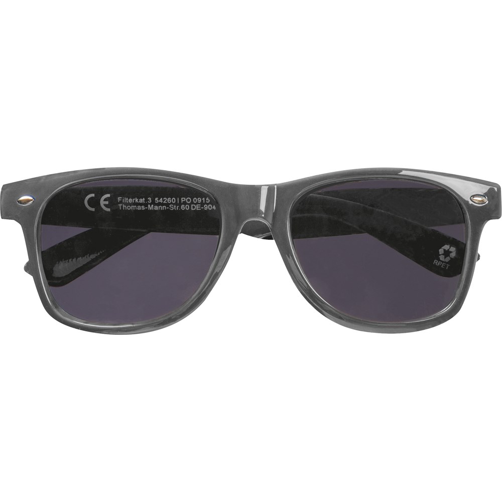 Sonnenbrille aus recyceltem PET mit UV 400-Schutz und CE-Filterkategorie 3. Umweltfreundlich und stilvoll, bietet zuverlässigen Schutz vor schädlichen UV-Strahlen. Ihr Werbung drucken wir auf einen Bügel.