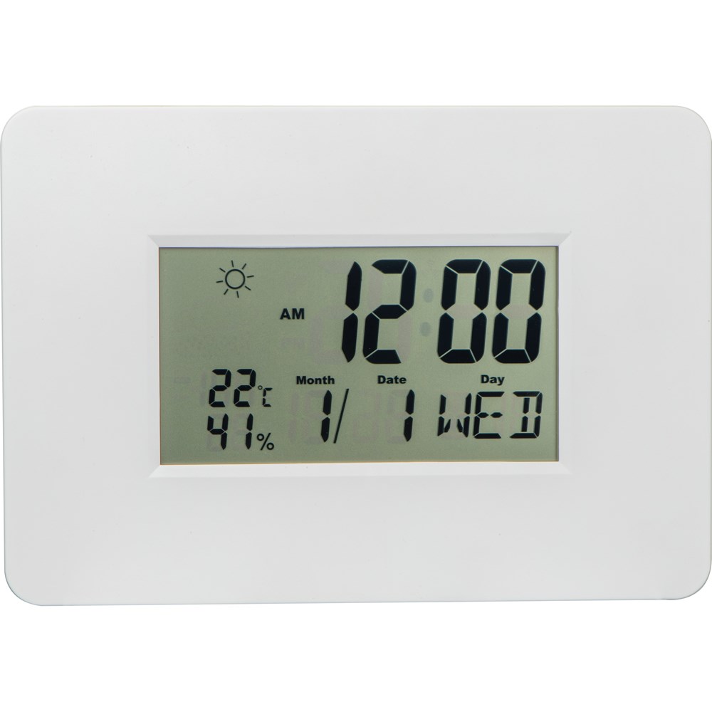 Digitale Wanduhr mit Kalender, Alarm und Schlummerfunktion, Thermometer und Hygrometer (automatische Aktualisierung der Werte alle 20 Sekunden) sowie einer Wetter-Anzeige. Ihre Werbung drucken wir unterhalb des Displays auf den Rand. Exklusive 2 AAA-Batterien, bestellen Sie diese gleich mit (Art. 999400).